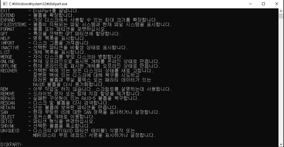 관리자 권한으로 실행: diskpart